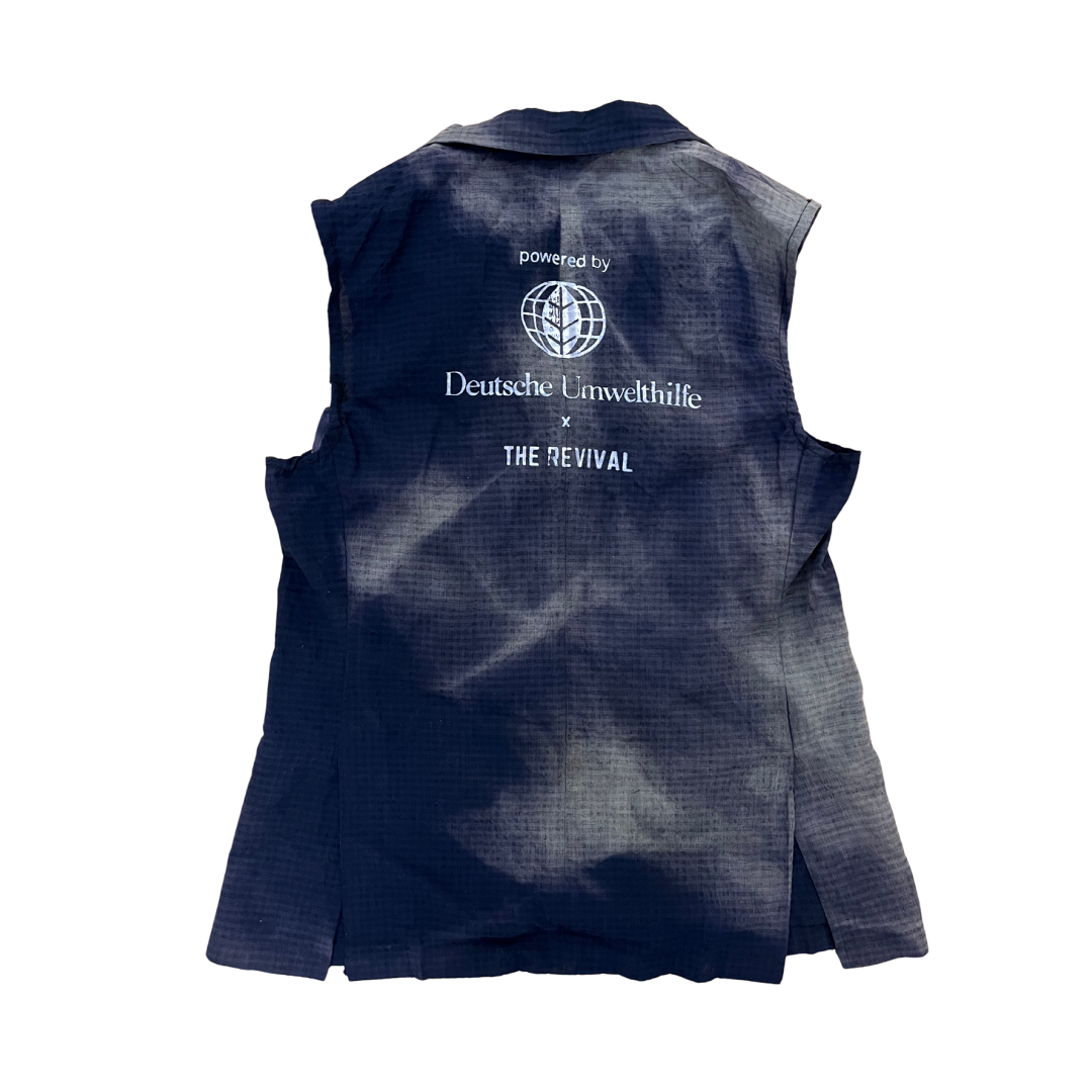Auf der Rückseite ist das Co-Branding von Deutsche Umwelthilfe x The Revival zusehen. Ein sichtbares, handgemachtes Upcycling-Detail, das die Weste zu einem optimalen Begleiter für das nächste Fest macht. Der Farbverlauf der Weste macht diese Stück zu einem Unikat.