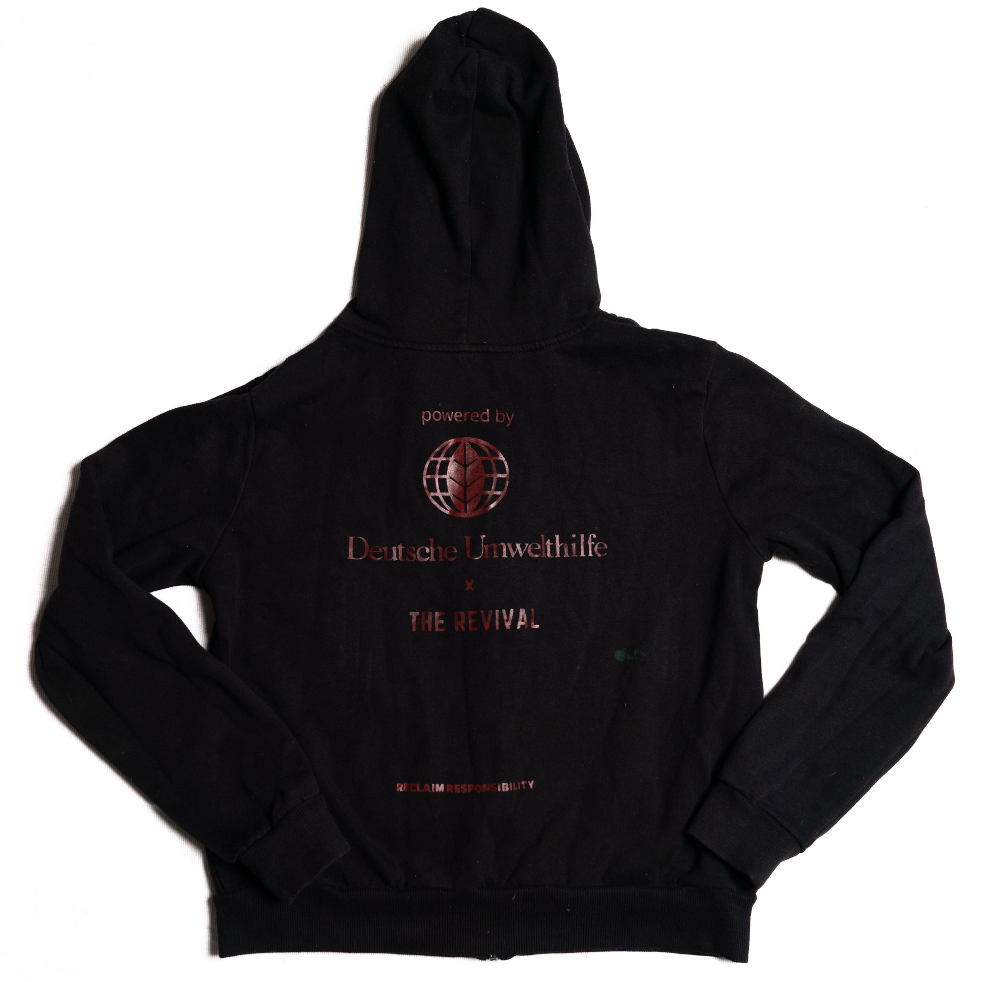 Die Rückseite zeigt das Co-Branding von Deutsche Umwelthilfe x The Revival – ein sichtbares, handgemachtes Upcycling-Detail, das dem Hoodie Charakter verleiht.