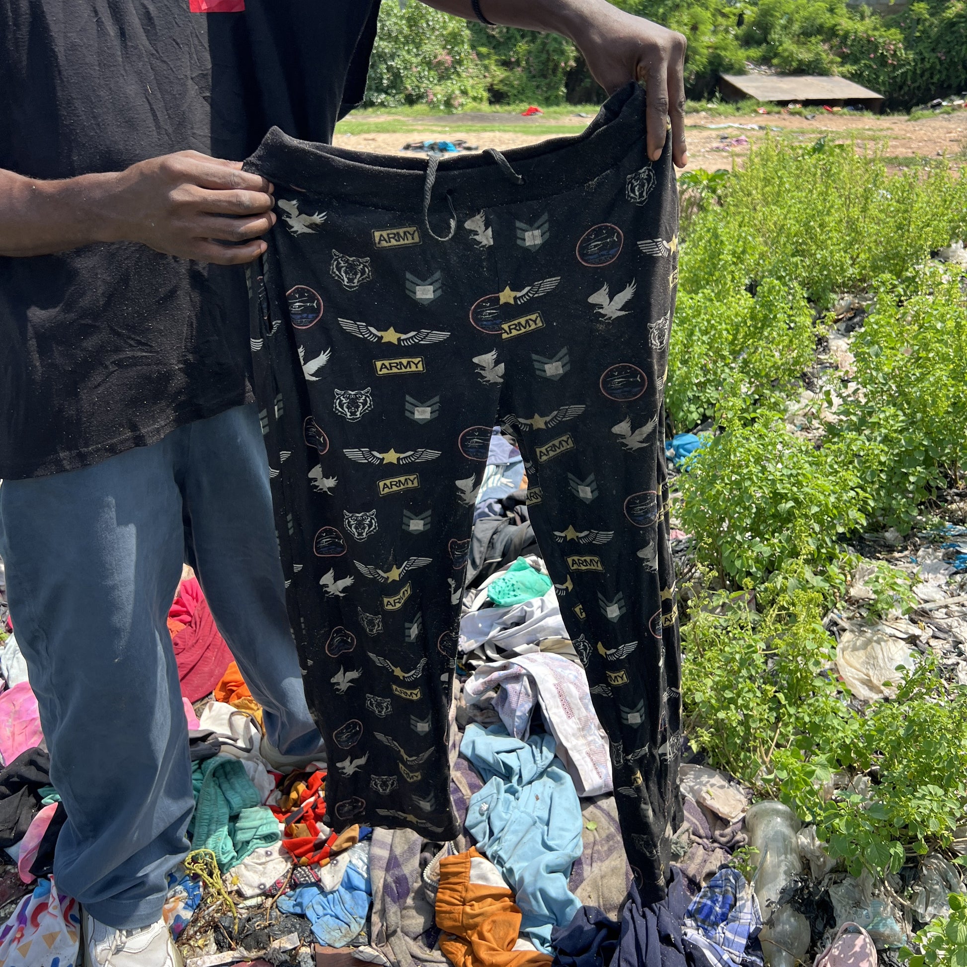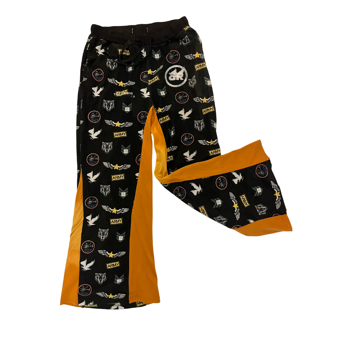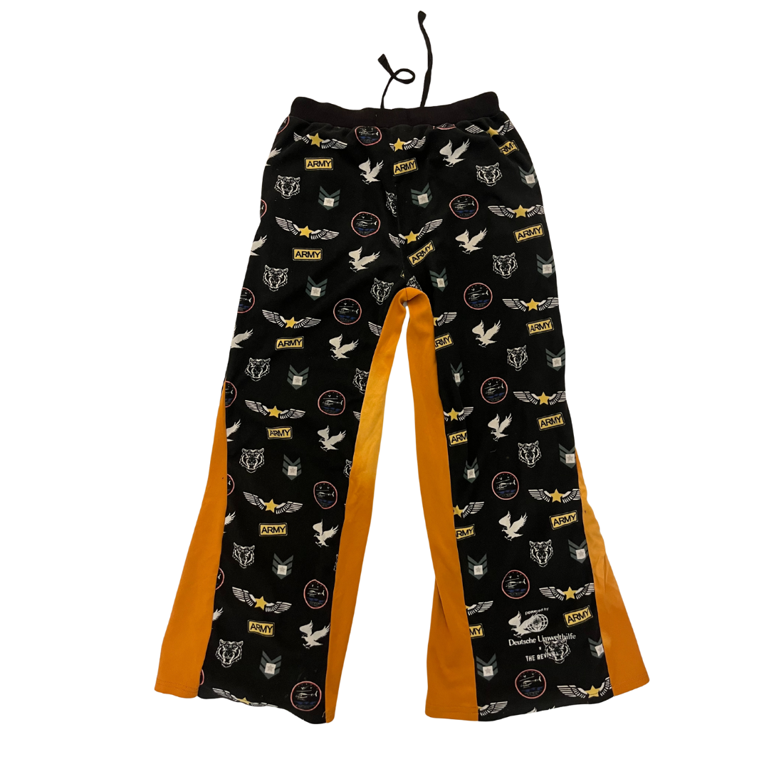 Diese schwarze Upcycling-Hose wurde in Ghana auf einem Textilmüllberg gesammelt und zu einem neuen Kleidungsstück zusammengesetzt. Die schwarze Hose hat einen entspannten Vibe und kann am Bund passend enger gemacht werden. Die Hose hat gelbe Akzente und einen bunten Aufdruck mit verschiedenen wiederkehrenden Details. Auf der Vorderseite befindet sich das helle RR-Kreislogo.