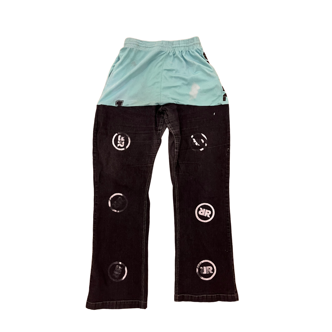 Sport trifft Statement: Diese einzigartige Upcycling-Hose kombiniert den elastischen Komfort einer mintgrünen Sporthose im oberen Bereich mit den robusten Beinen einer dunkelblauen Jeans. Der elastische Bund sorgt für Bewegungsfreiheit und Lässigkeit, während das Denim-Material Stabilität und Charakter verleiht.