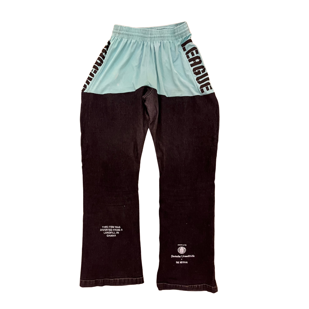 Seitlich auf Hüfthöhe steht in weißer Schrift der Schriftzug „LEAGUE“. Am Hosenbein prangt der Print „This item was diverted from a landfill in Ghana“, ergänzt durch das Co-Branding von The Revival x Deutsche Umwelthilfe am unteren Beinabschluss.