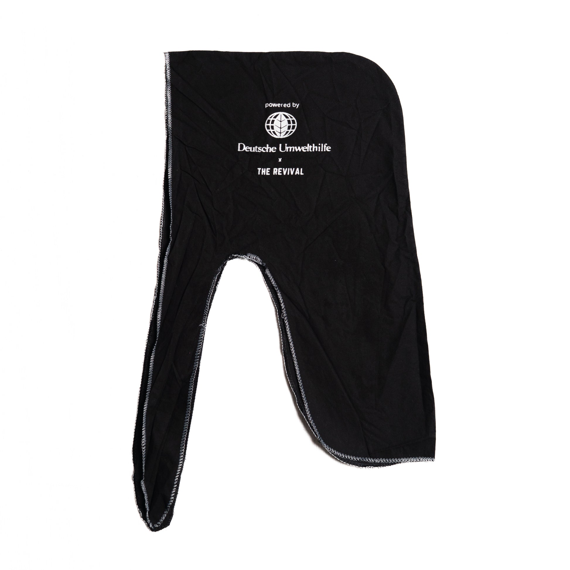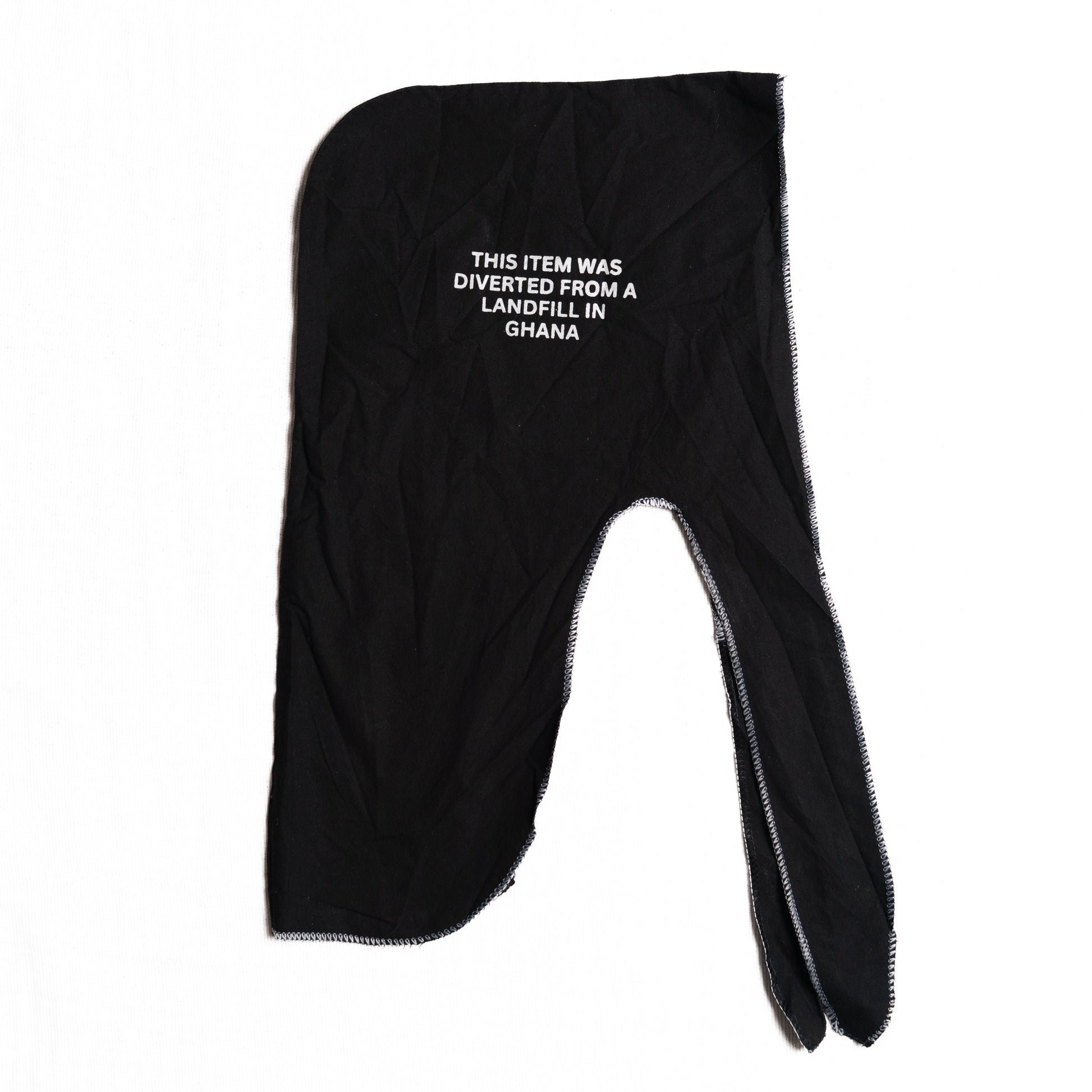 Die Kapuze besteht aus schwarzen Stoff und trägt auf der Vorderseite den markanten Nachhaltigkeitsprint: „This item was diverted from a landfill in Ghana“. Die langen Seitenbahnen können locker hängen gelassen oder kreativ gestylt werden – etwa gebunden, geschlungen oder unter einer Jacke getragen.