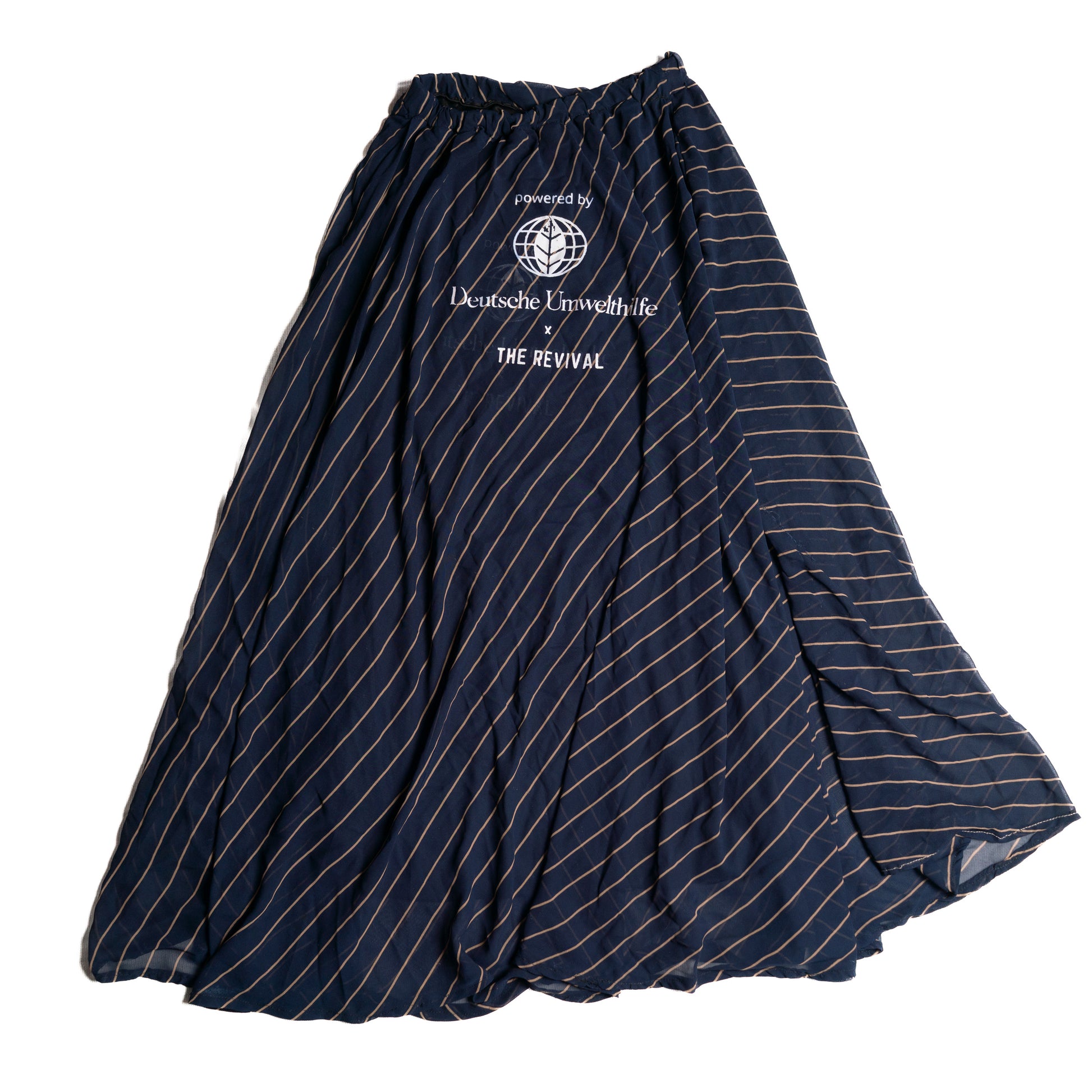 Der Rock besteht aus leichtem, fließendem Stoff mit feinen Streifen. Der elastische Bund sorgt für bequemen Halt und eine flexible Passform. Auf der Vorderseite findet sich das RR-Symbol sowie der dezente Schriftzug RECLAIM RESPONSIBILITY – ein Aufruf zu Verantwortung und bewusstem Konsum. Das „powered by Deutsche Umwelthilfe“-Logo und THE REVIVAL tragen ein klares Statement auf. Kleine Gebrauchsspuren machen jedes Stück unverwechselbar.