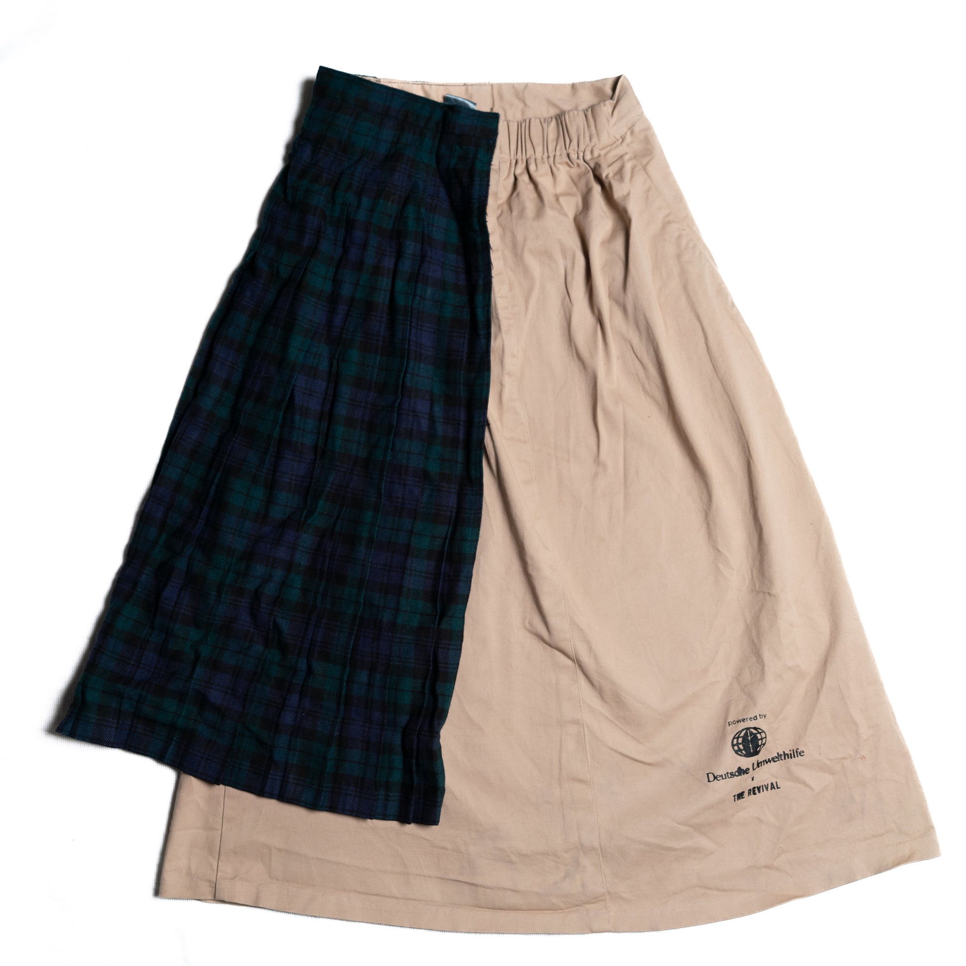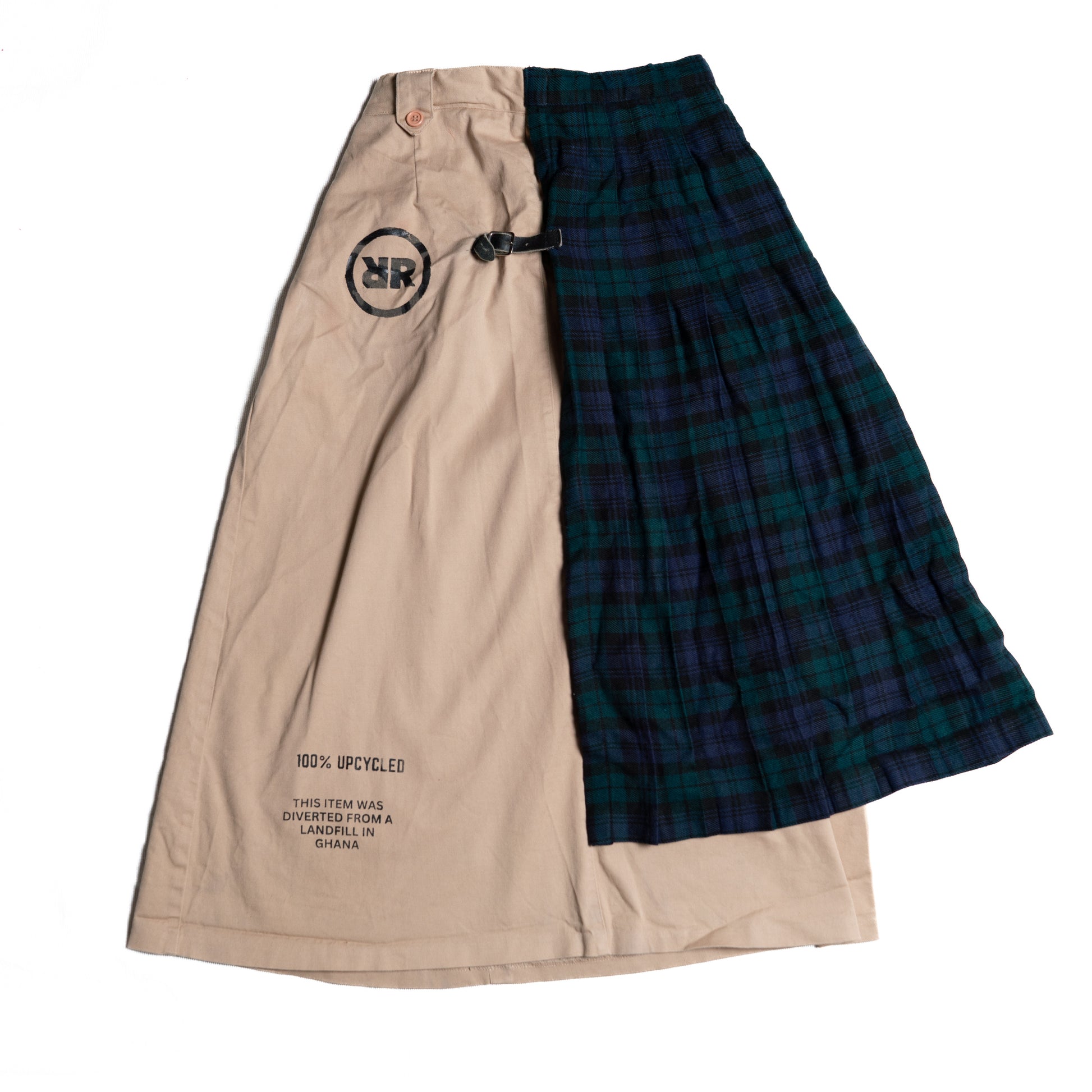 Dieser Upcycling-Rock wurde in Ghana aus gesammelten Alttextilien gerettet und in einem kreativen lokalen Prozess neu gestaltet. Das auffällige Zwei-Seiten-Design kombiniert eine beige Seite mit einer dunkel karierten Tartan-Seite in Grün–Blau. Beide Elemente wurden zu einem harmonischen, asymmetrischen Rock zusammengesetzt, der durch seine ungewöhnliche Silhouette und Farbkombination sofort ins Auge fällt.