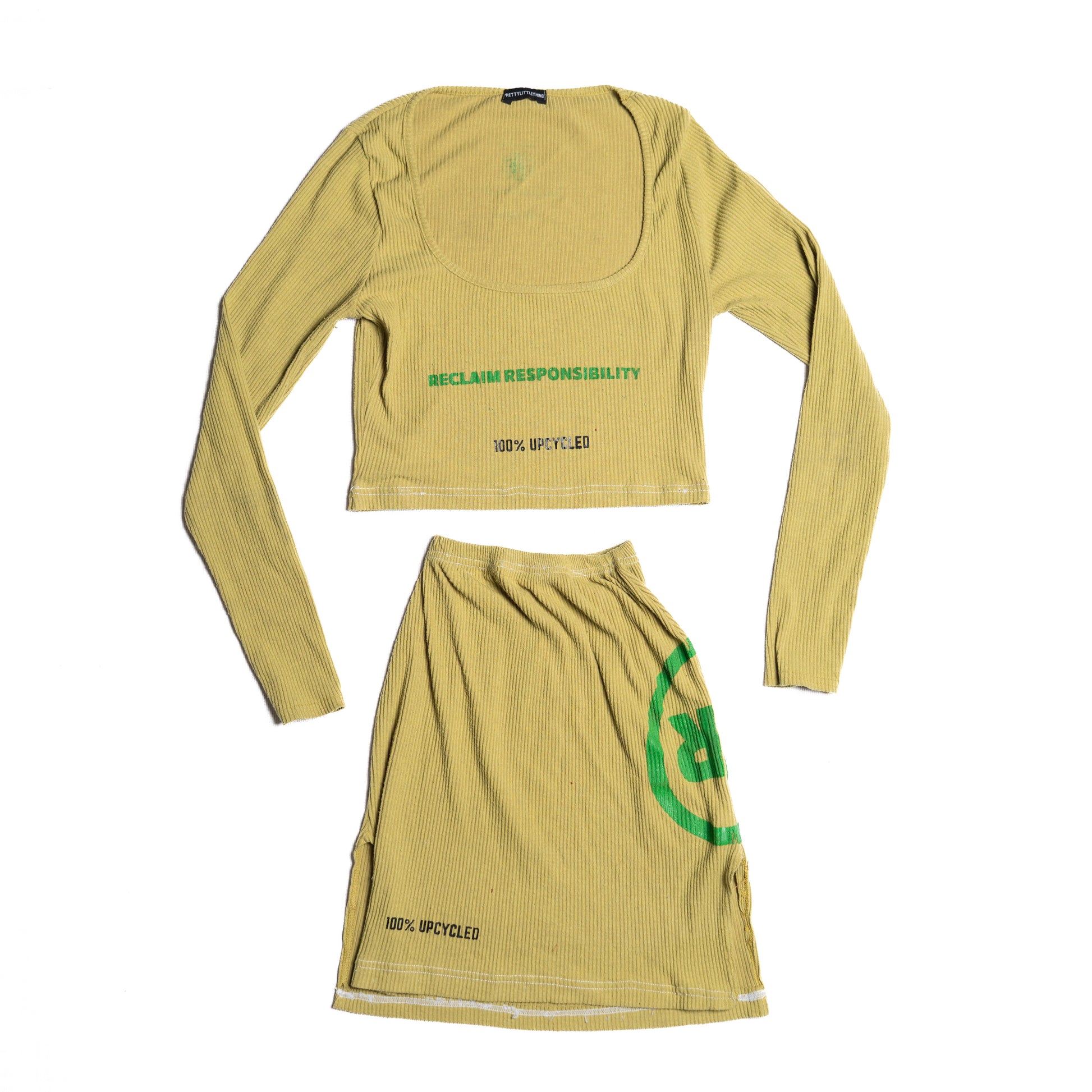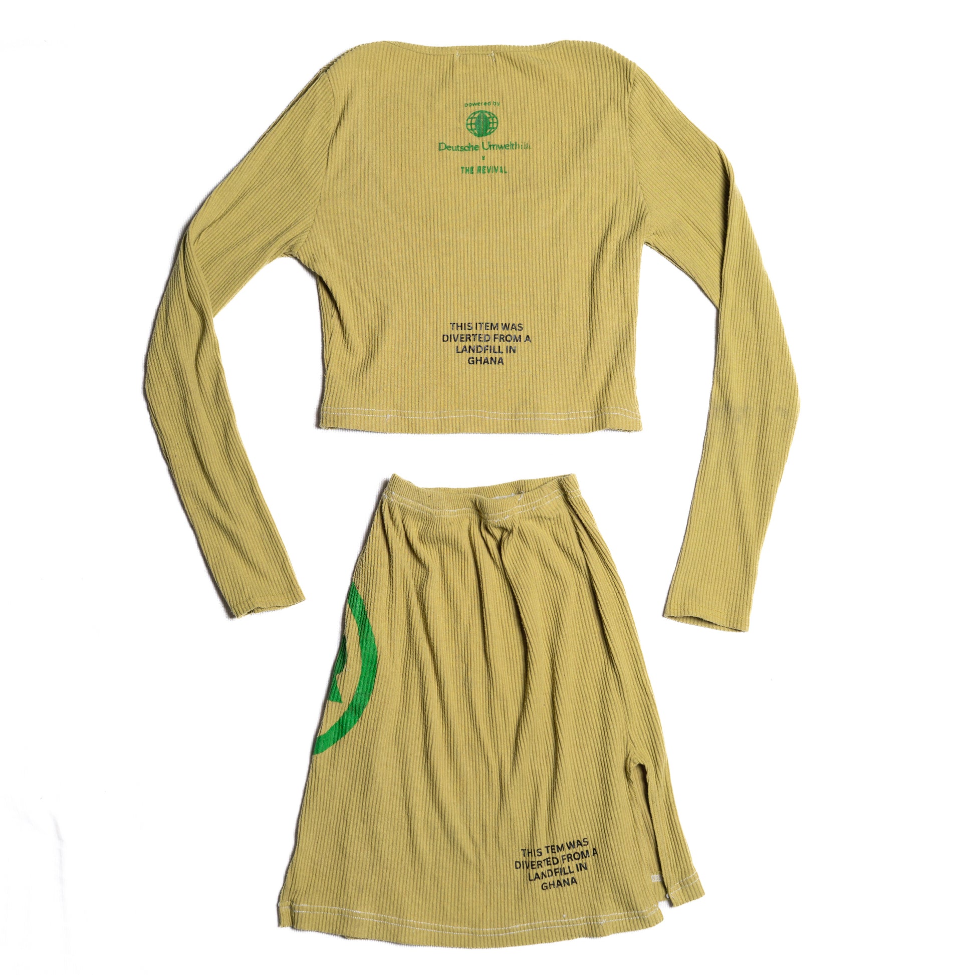 Dieses zweiteilige Upcycling-Set wurde in Ghana aus geretteten Textilien gefertigt und besteht aus einem langärmligen Crop-Top sowie einem passenden Minirock. Beide Teile bestehen aus einem elastischen, gerippten Material in einem Olivton. Das Top hat einen tiefen, eckigen Ausschnitt und liegt körpernah an, während der Rock mit seinem weichen Fall und seitlichen Schlitz eine lässige Silhouette erzeugt.