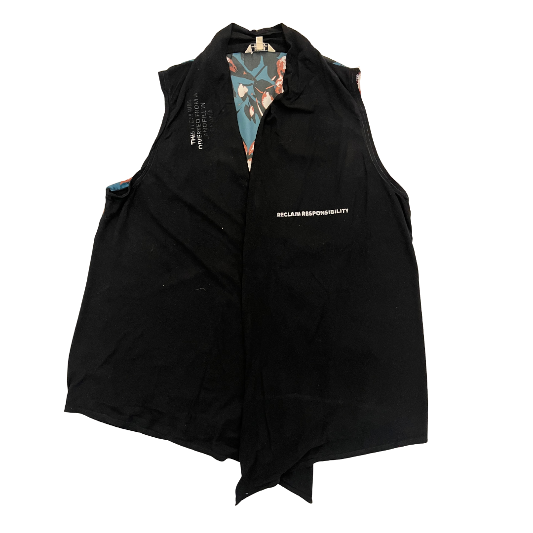 Diese offene Upcycling-Weste verbindet klare Linien mit einem expressiven Rücken. Vorne schlicht in Schwarz gehalten, trägt sie in weißer Schrift das Statement „Reclaim Responsibility“ sowie den Aufdruck „This item was diverted from a landfill in Ghana“ – eine klare Ansage gegen Fast Fashion.
