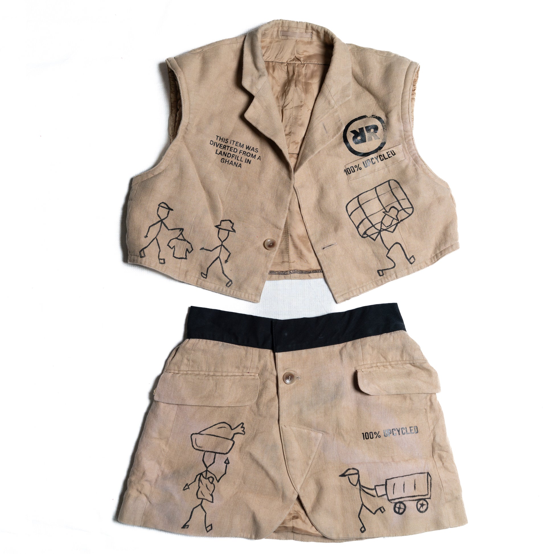 Die Weste trägt Reclaim-Responsibility-Prints, ein groß aufgenähtes Statement-Patch auf der Rückseite und klare Hinweise auf ihre Rettung aus dem Textilmüll. Der Rock übernimmt den beigen Grundton und wird durch minimalistische Prints und einen kontrastierenden, dunklen Bund ergänzt. Zusammen entstehen zwei Einzelstücke, die perfekt aufeinander abgestimmt sind und gemeinsam eine kraftvolle Upcycling-Geschichte erzählen.