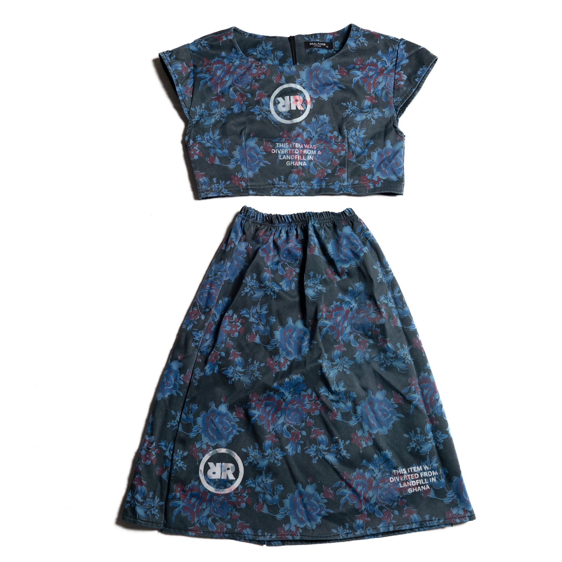 Dieses zweiteilige Upcycling-Set wurde in Ghana aus geretteten Textilien gefertigt und besteht aus einem kurz geschnittenen Top sowie einem passenden Midirock.